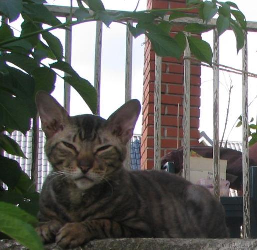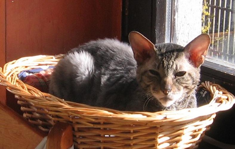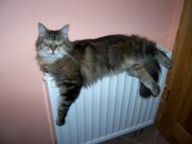 She is a Cornish Rex, who loves heat, which is typical for this race. She has spent 10 years with me... In the summer she lies in the sun or goes into the garden. It is never too hot for her. In the winter she lies on the radiator, changing the sides... If it is cold, she wears a turtleneck :)) She loves sleeping in bed, especially under my armpit. She eats A LOT, what influences her figure. She could eat anything, apart from dry food. She waits impatiently for every meal.