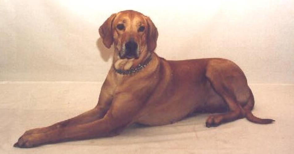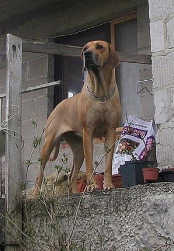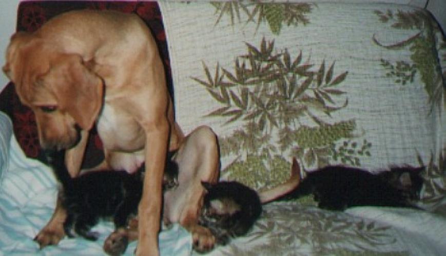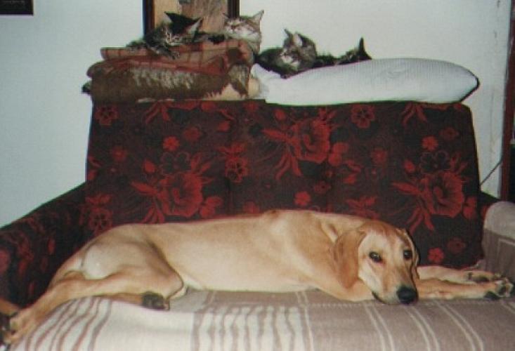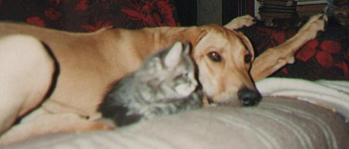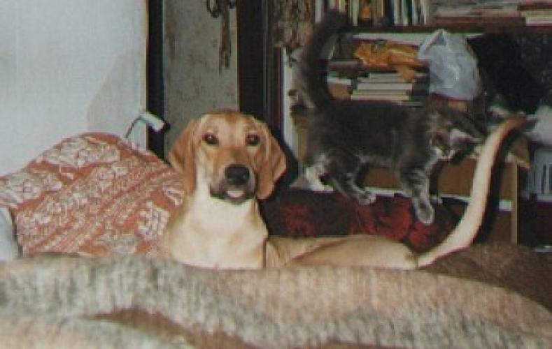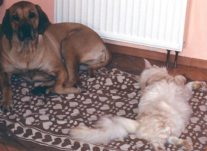 Young cats ignore her, but it seems that such a huge Rhodesian is a challenge to a tiny kitten..." – it is now, sadly, past.......