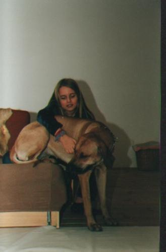 "AMBRA – daughter of Canga – born on 19.06.2001 as the last one in the litter. She weighed 60 dkg. She was so pretty young girl that I fell in love with her... She stayed with us and grew up a bit... :))))), she weighs 45 kg and still behaves as a puppy... She was brought up with cats and she likes all of them. She respects Zuzia very much, and her best friend is Basil.