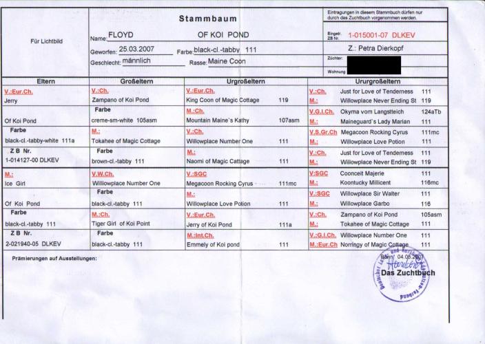 Ma bardzo ciekawy rodowód, to "mieszanka" polskich, niemieckich, norweskich, amerykańskich linii hodowlanych i czas pokaże czym to będzie skutkowało w jej potomstwie. Na razie jest wesołą i psotną kotką, z zapałem polującą na wszelkiego rodzaju owady i z apetytem je spożywającą, a feeee....