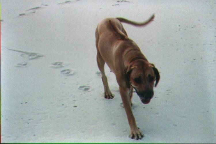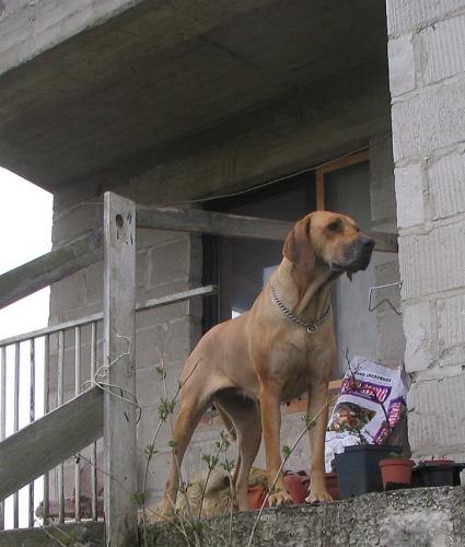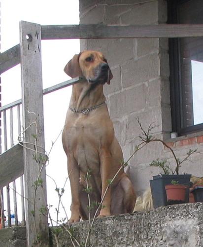 "AMBRA – córka Cangi – urodziła się 19.06.2001 roku, jako ostatnia z miotu, ważyła 60 dkg. Prześliczna suczka, która od razu podbiła moje serce swoją urodą... Została z nami, trochę urosła... :))))), waży 45 kg, ale nadal ma duszę młodego psa, czasami aż za bardzo... Wychowana z kotami, bo jakże mogłoby być inaczej... Lubi wszystkie, do Zuzi podchodzi z ogromnym szacunkiem, ale najbardziej zaprzyjazniła się z Basilem.
