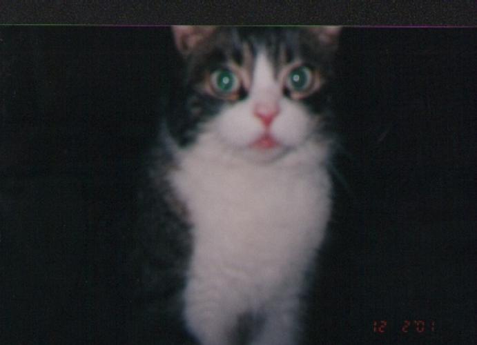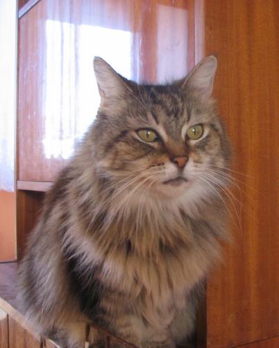 Przybłąkał się do mojej Mamy, jako małe kociątko... miał cudowny niebieski kolor z którego z czasem o dziwo..."wyrósł", początkowo dokarmiany w ogródku, potem zabrany do domu, żeby zapewnić mu bezpieczeństwo (obok jest szosa) czekał na znalezienie dobrego domu... no i znalazł... u nas. Mieszka teraz na wsi i prowadzi wspaniały żywot pogodnego kastrata, przebywa w ogrodzie od wczesnej wiosny do późnej jesieni, kot o najpiękniejszych kocich oczach, jakie kiedykolwiek widziałam. Jest z nami już 12 lat...