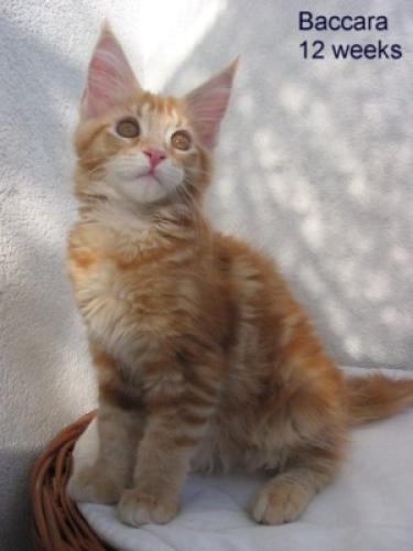 Baccara, Baccunia – miała 6 tyg. kiedy zobaczyłam jej zdjęcie, słodkie kociątko z różowym noskiem i ten niesamowicie rudy kolor... Przywiozłam ją z Krakowa, przebyła tę podróż z przerwą na odpoczynek u mojej rodziny w Warszawie, zawojowała wszystkich swoim delikatnym, prawdziwie kocim wdziękiem oraz urodą. Kotka, która uzyskała w bardzo trudnej grupie tytuł Championa na trzech! wystawach w dużej konkurencji. Jest bardzo łagodna, miła i spokojna, żyje w przyjazni z innymi kotami, "zadymy" to nie dla niej. Ma w sobie ogromne macierzyństwo, po porodzie umyła całą Boni, koniecznie chciała opiekować się jej dziećmi... Jest zawsze taka trochę zadumana w sobie, ale bardzo lubi wizyty gości i wtedy "podstawia" się do głaskania.