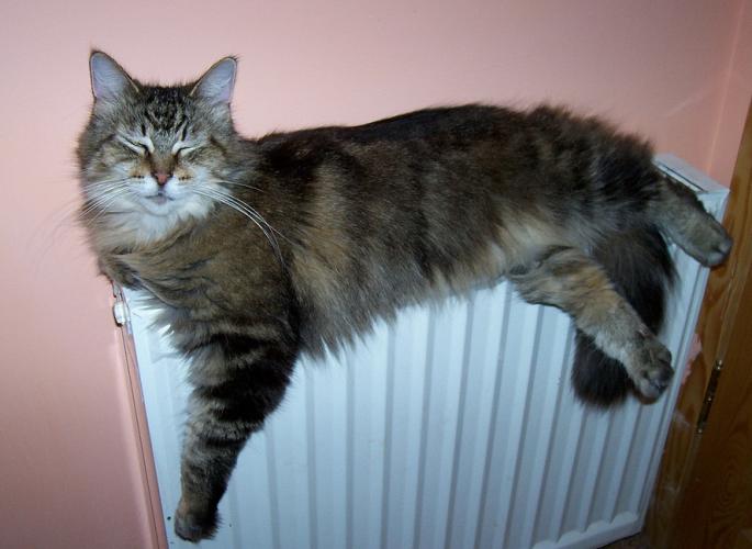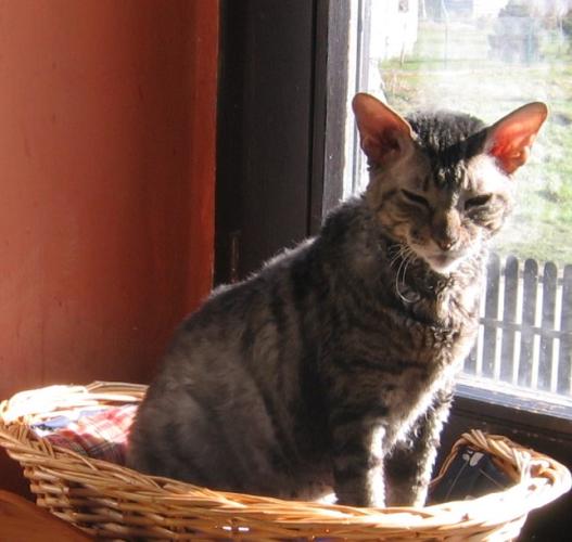 " Kotka rasy Cornish Rex, która jest ze mną już od prawie 14 lat... tak jak wszystkie koty tej rasy, uwielbia ciepło. Latem wygrzewa się w słońcu, lubi wychodzić do ogrodu w upalne dni i nigdy nie jest jej za ciepło. Natomiast zimą leży na kaloryferze, zmieniając tylko boki... W bardzo chłodne dni chodzi ubrana w golf :)), lubi spać w łóżku i wtedy wtula się pod pachę, przesypia tak do samego rana... Ma OGROMNY apetyt, co ma wpływ na jej figurę, je właściwie wszystko, nie gustuje tylko w suchym pokarmie, zawsze niecierpliwie czeka na posiłki. Kotka o ogromnym temperamencie i bardzo skoczna. "