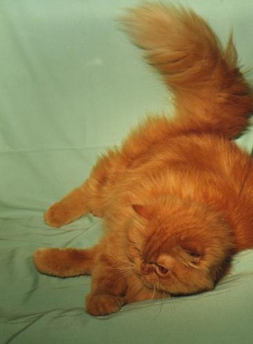 Tak naprawdę TAFUNIA Alzo *PL – moja pierwsza kotka, kochana "mrówkojadka", wykastrowana w wieku 8 lat, słodki rudzielec o pięknym futerku, uwielbiała przebywać w ogrodzie i wcale nie tylko przy ładnej pogodzie... kłóciła się ze mną o wypuszczenie na dwór nawet wtedy gdy lało jak z cebra... bardzo zdecydowany charakter... swego czasu ganiająca Mruczka, po kastracji zapomniała o co jej chodziło i łaskawie zezwoliła na coś w rodzaju przyjaźni.. chodziła swoimi ścieżkami – w upalne dni najłatwiej znaleźć ją było śpiącą pod tują lub innym krzakiem, najstarsza z całego kociego towarzystwa, w tym roku 25 lipca skończyłaby 15 lat.................